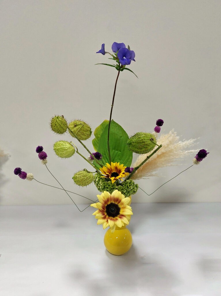 支部からは3名が出瓶しました。 今回の出瓶にあたり意識したのは、池坊の基本に立ち返り、「花をいかに生かすか」という点でした。使用した花材は、季節の移ろいを感じさせるものや、一本一本の持つ表情や生命力を丁寧に見つめながら取り合わせを考えました。自分の地域、身の回りにある花材を多く使用して、季節感はもちろん、地域の風土や空気感も作品に映し出されたのではないかと思います。